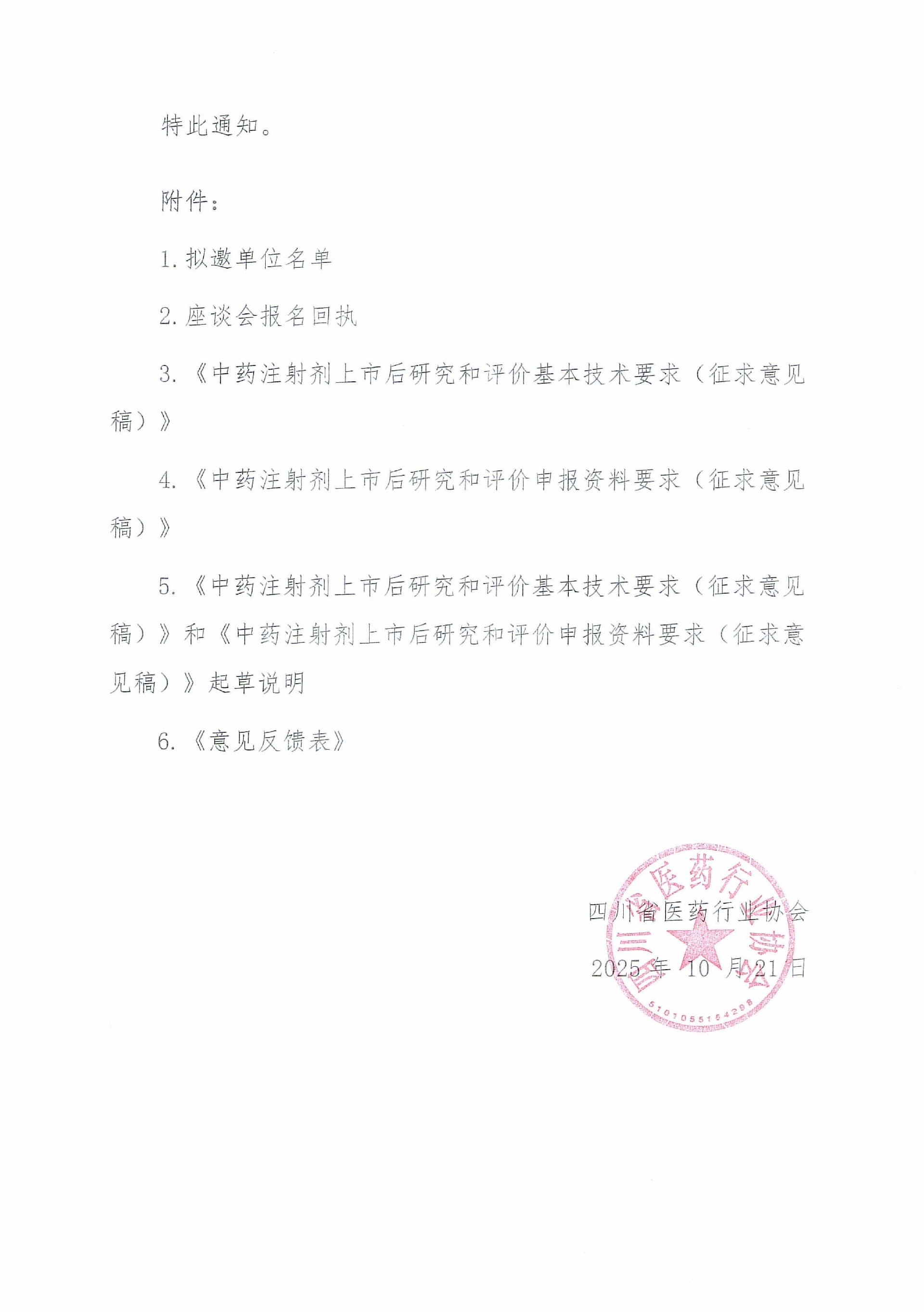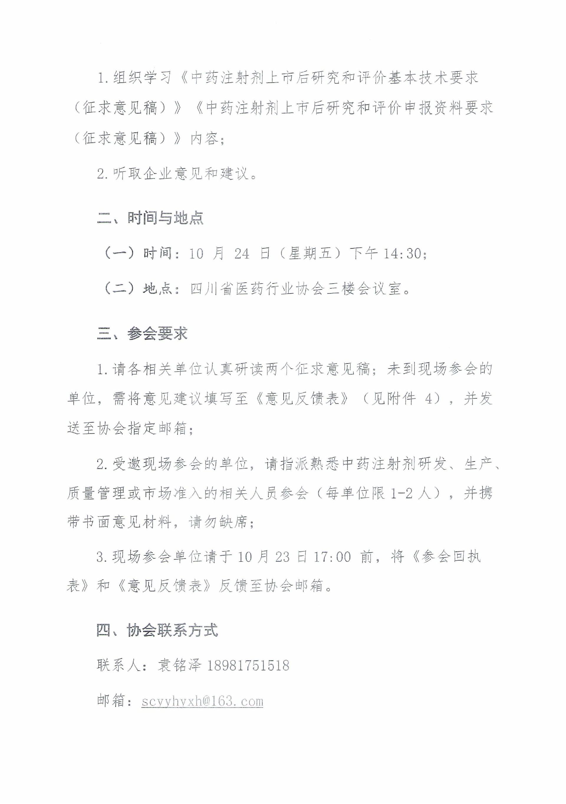 关于召开《中药注射剂上市后研究和评价基本技术要求(征求意见稿)》《中药注射剂上市后研究和评价申报资料要求(征求意见稿)》征求意见座谈会的通知