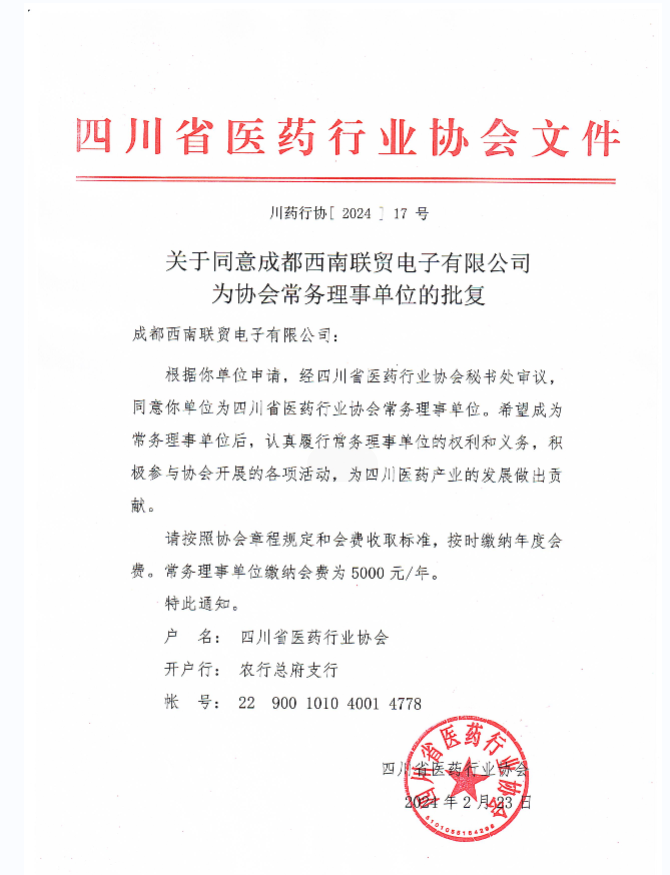 关于同意成都西南联贸电子有限公司 为协会常务理事单位的批复