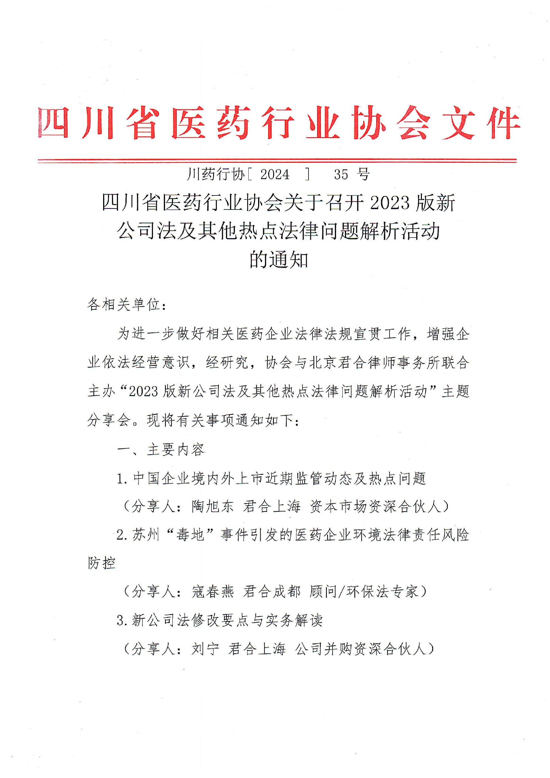 四川省医药行业协会关于召开2023版新公司及其他热点法律问题解析活动的通知