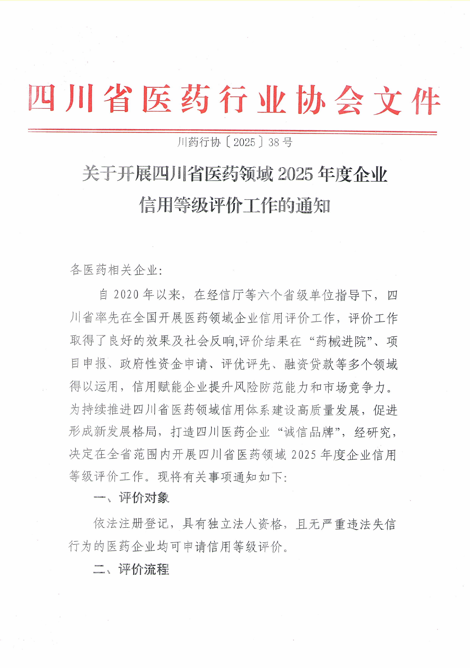 关于开展四川省医药领域2025年度企业信用等级评价工作的通知