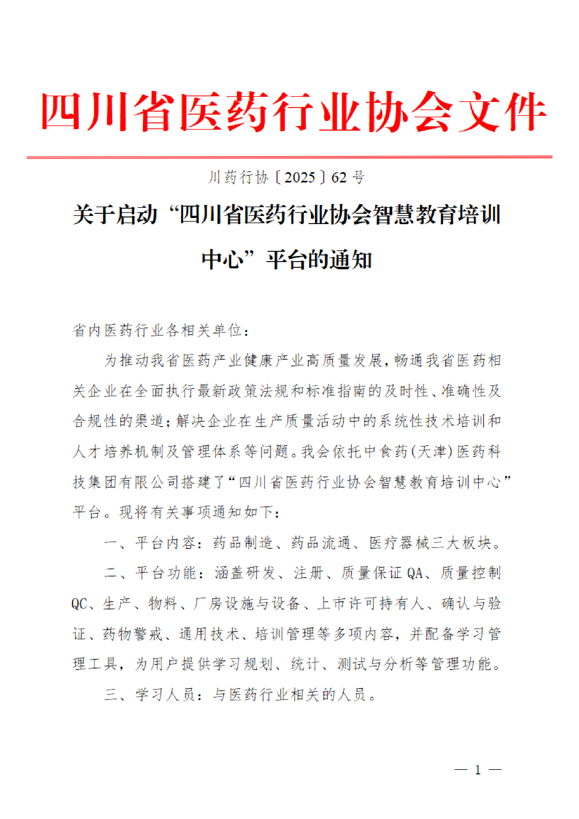 关于启动“四川省医药行业协会智慧教育培训中心”平台的通知