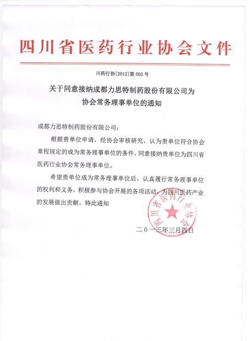 根据贵单位申请,经协会审核研究,认为贵单位符合协会章程规定的成为常务理事单位的条件,同意接纳贵单位为四川省医药行业协会常务理事单位。