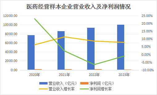 数据显示,2020至2023年,33家医药经营样本企业营业收入呈现出持续增长的态势,2023年总营收达到10101.78亿元,较上一年度增长7.80%。这一增长趋势背后,是对医药产品需求的不断上升。然而,尽管营业收入保持增长,同样净利润却出现了下降,2023年净利润为182.52亿元,同比下降1.05%。政策环境的变化,如药品降价、医保控费等,对企业的盈利水平产生了影响。